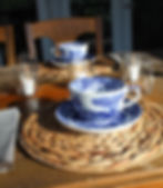 I love serving soup in giant teacups. These Spode Blue Italian mugs add a fun pop of color to a simple table setting. I added some woven chargers, neutral herringbone napkins, stemless wine glasses, and some votive candles.